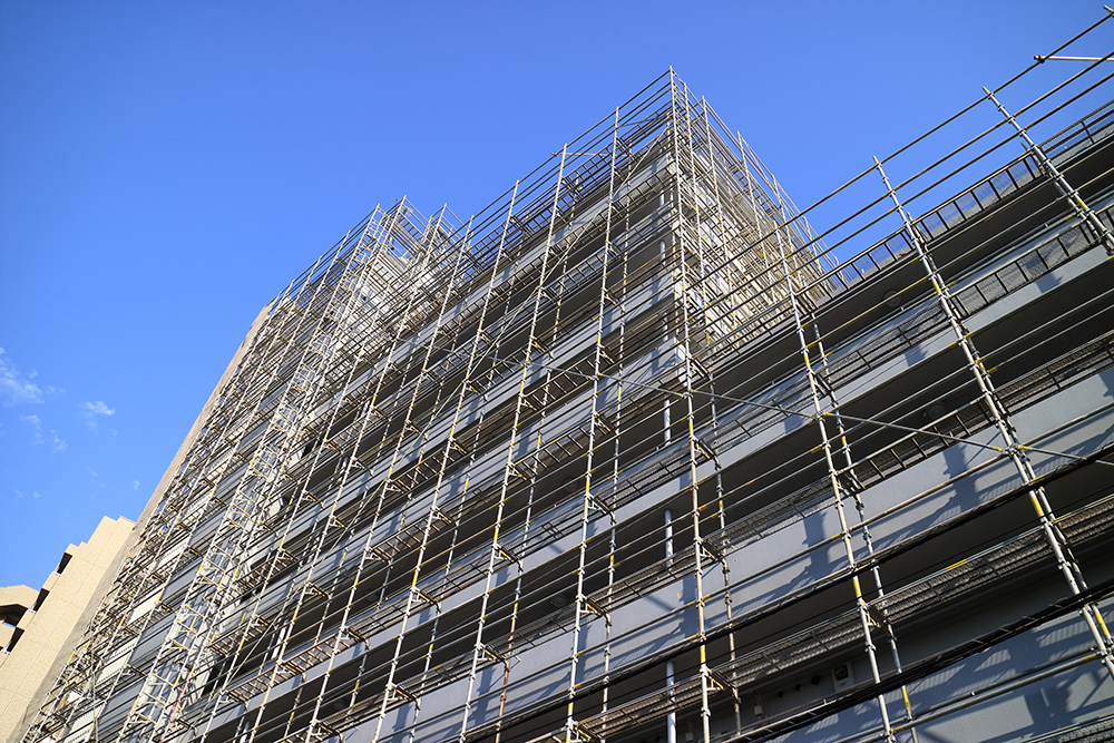 マンション・ビル・店舗・学校・工場・テーマパークなど、多種多様な建設現場で使用される足場の組立・解体を行ないます。改修工事・リフォーム工事の際に必要となる足場の設置をメインに請け負っております。